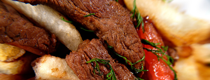 El tradicional lomo fino saltado con todos los aromas ahumados del wok, crujientes cebollas y jugosas tiras de tomate, acompañado con Arroz y papas fritas